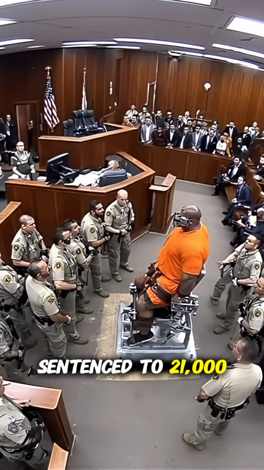 Brutus, 6’6″, built like a vending machine with anger issues, was already strapped into heavy restraints after multiple “episodes” earlier in the trial, including allegedly attempting to head-butt a water cooler.