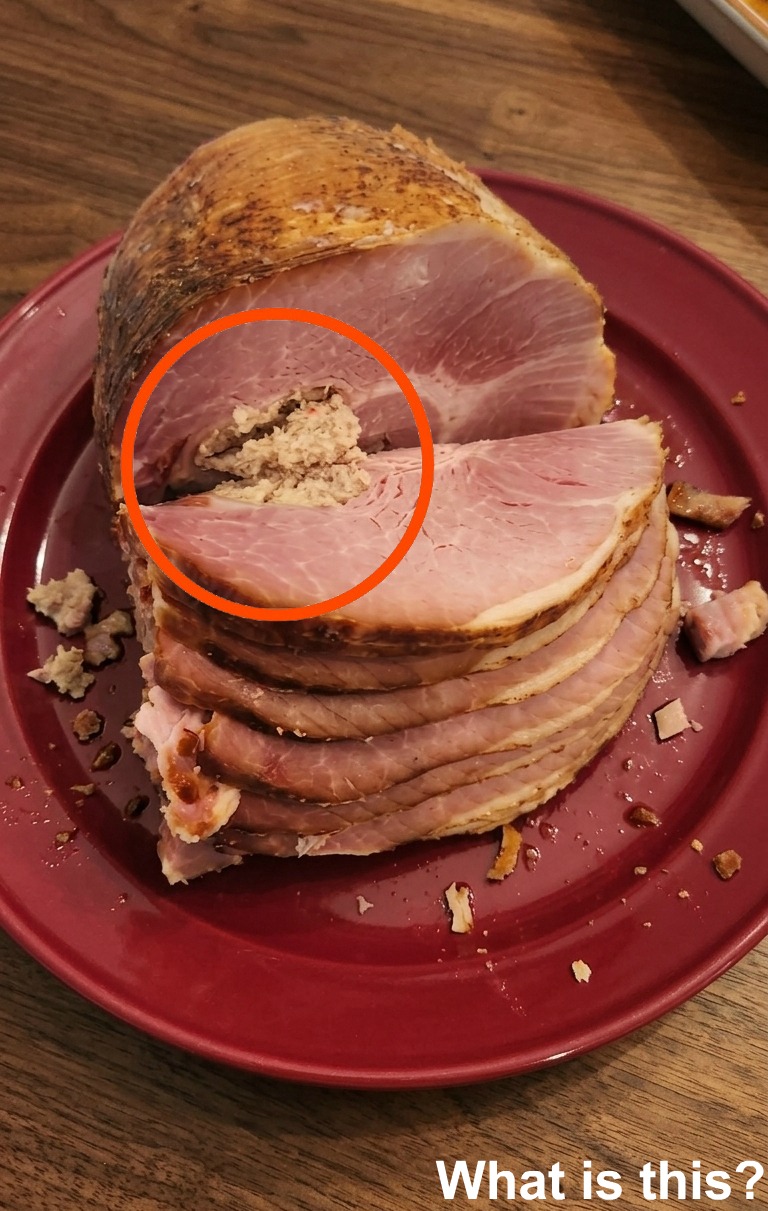 Right there, in the center of the ham, was something unusual. It didn’t match the rest of the meat at all. Instead of the smooth, consistent texture I had been slicing through, this was a compact, grainy mass — almost like a small cluster embedded within. Its appearance was different enough to immediately raise questions.