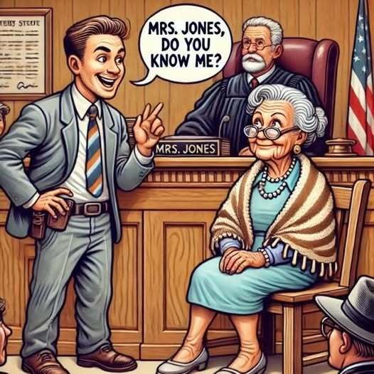 The lawyer was stunned. Not knowing what else to do, he pointed across the room and asked, “Mrs Jones, do you know the defence attorney?”